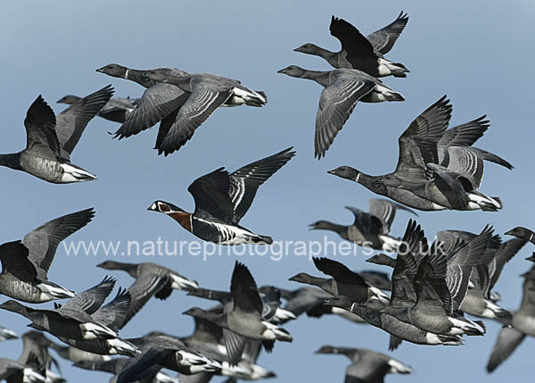 Earlier in the week we visited one particular group that is favouring Sturt Pond and adjacent areas of grassland and saltmarsh, at the base of Hurst Spit near Lymington. In the main the flock comprises individuals of the dark-bellied race of Brent Goose Branta bernicla bernicla. But at the moment they are accompanied by an unusual cousin of theirs, a Red-breasted Goose Branta ruficollis; this is a rare visitor to Britain that by rights should be wintering in Romania or Bulgaria. It seems quite at home amongst its more sombre cousins, despite the occasional squabble with a grazing neighbour.