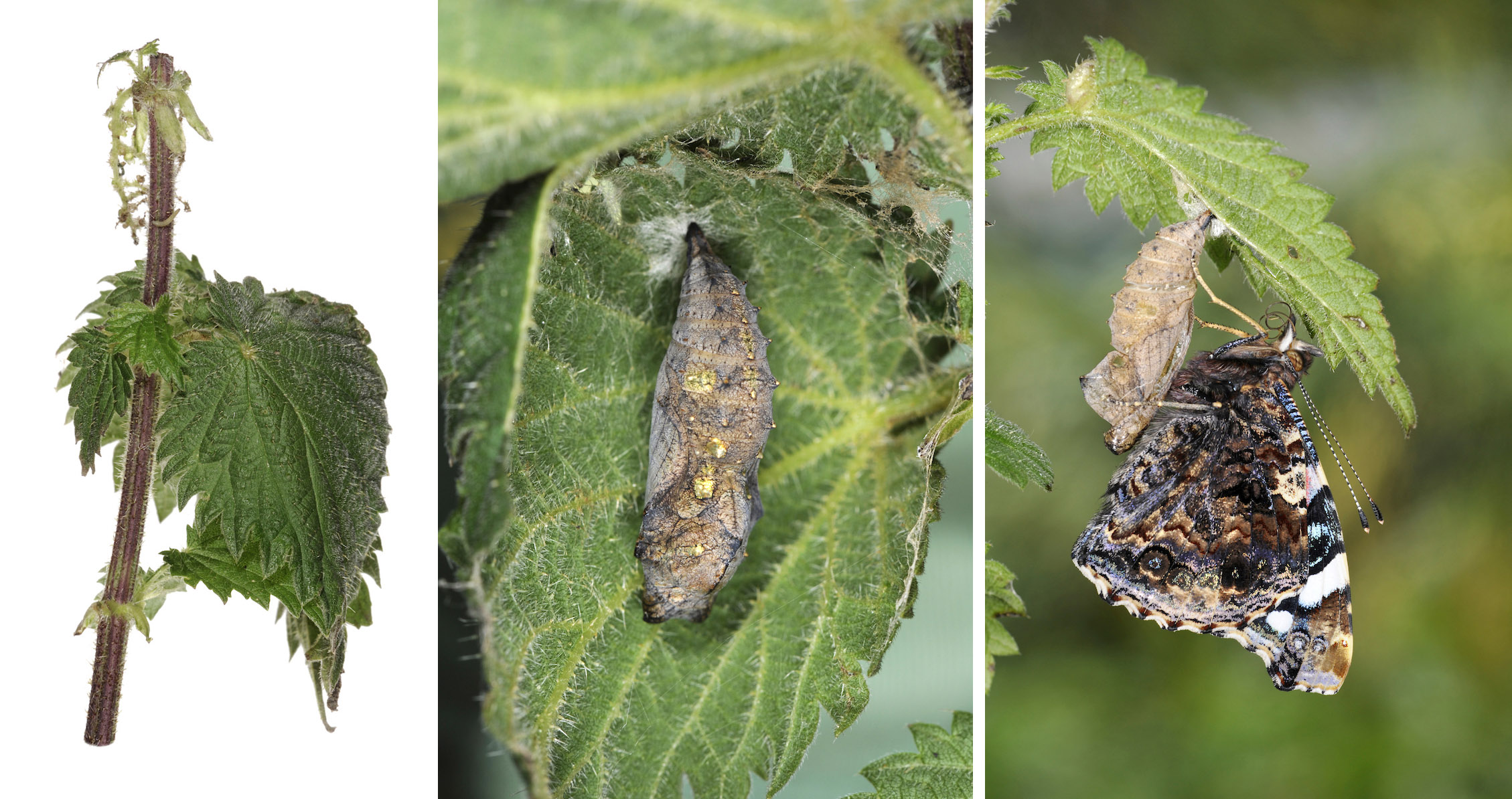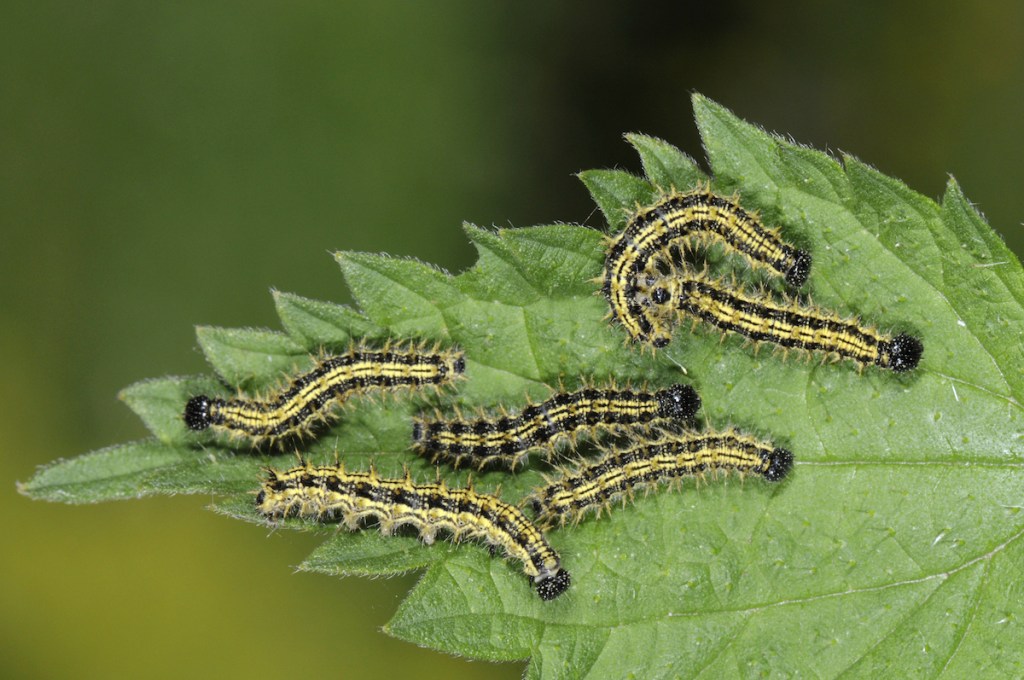 Classic garden species that feed on Common Nettle include the Small Tortoiseshell Aglais urticae, Peacock Aglais io and Red Admiral Vanessa atalanta. With the exception of the latter species, their larvae are conspicuous. They pupate on the foodplant and hibernate as adults. This means that tidying up nettle patches in winter will not unduly affect the life-cycles of the butterflies.