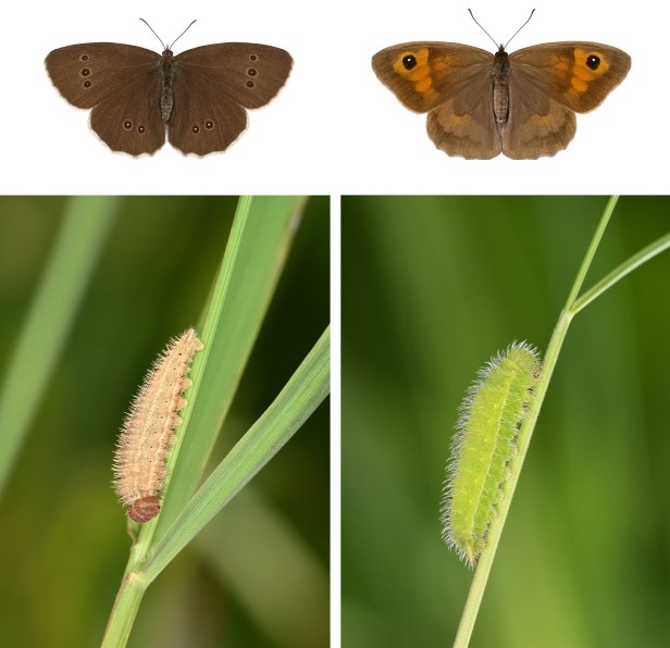 Moving on to the third photograph – the one showing grazing sheep. The potential for conflict between that use of the land, and benefits to butterflies, dispels any notion that you can have your environmental cake and eat it. Returning to the idea of unintended consequences, if you graze Solar Park grassland intensively with sheep you will almost certainly destroy the life-cycles of many meadow species of butterfly. For example, the caterpillars of the Ringlet and Meadow Brown spend the winter months among tussocks of grasses such as Yorkshire-fog and Red Fescue, while those of the Large Skipper bind the leaves of Cocks-foot together with silk for hibernation dens. Come the spring, and they feed on the shooting grass leaves. Nibble these grasses to within an inch of their lives and you will most likely kill the caterpillars and hence the life-cycle. As individual adults, these butterflies are lucky to live longer than a week, and once females have laid their eggs, their job is done. By contrast, the caterpillar stage lasts more than 250 days.